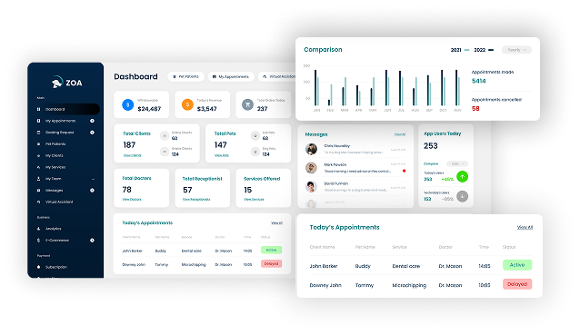 Keep track of appointments, vaccines, and reminders in one place. Zoa’s streamlined dashboard ensures smooth operations and top-notch patient care.